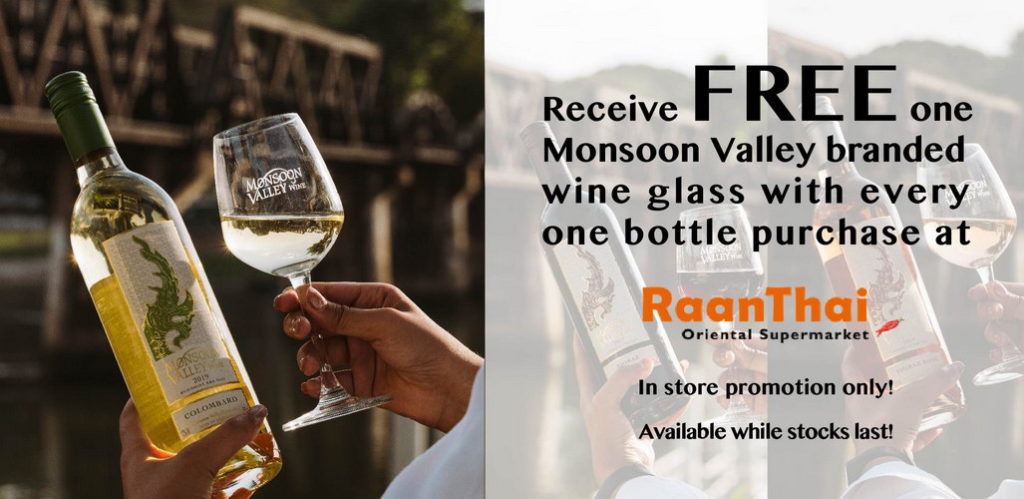 Get one free branded Monsoon Valley wine glass with every one Monsoon Valley wine bottle bought at Raan Thai shop!